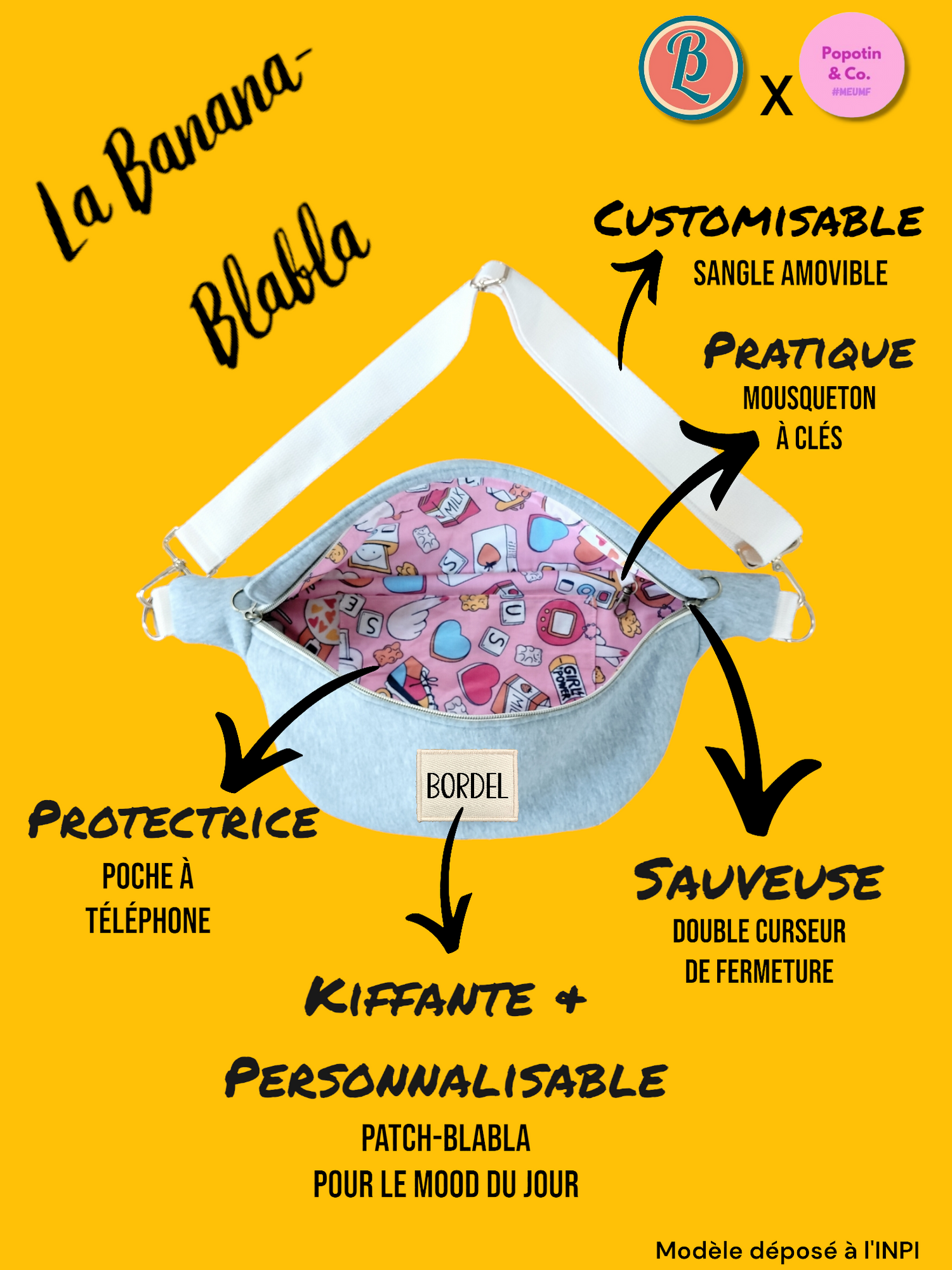 Cette banane tendance et cocooning comme jaja s'accorde avec de nombreuses tenues .... et de nombreuses sangles ! Elle est fournie avec une sangle unie. Mais aussi et surtout, cette Banana-Blabla est conçue pour suivre vos envies et votre mood, puisque vous pouvez changer l'étiquette* quand vous voulez ! choisissez un patch-blabla ou créez-en un sur mesure, faites une collection, et changez le message de votre banana-blabla quand vous voulez !